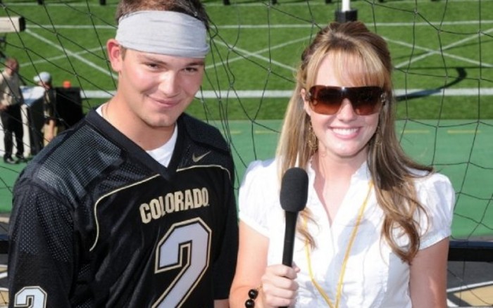 Interviewing a CU student at football for BuffsTV on CUBuffs.com