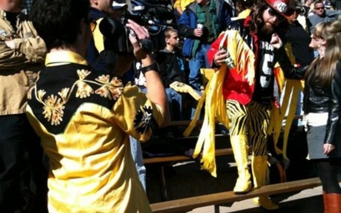 Interviewing an avid Colorado fan at a football game